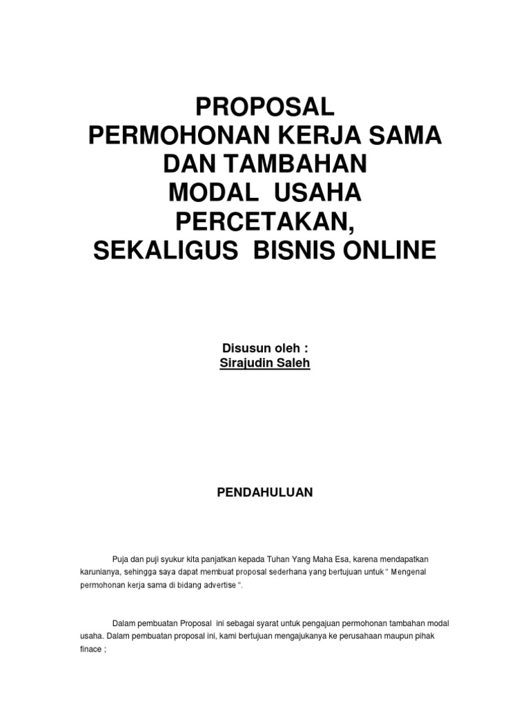 Contoh Proposal Kerjasama Usaha Bagi Hasil Jasa Dan Perusahaan from titikdua.net We did not find results for: Check spelling or type a new query. Maybe you would like to learn more about one of these?